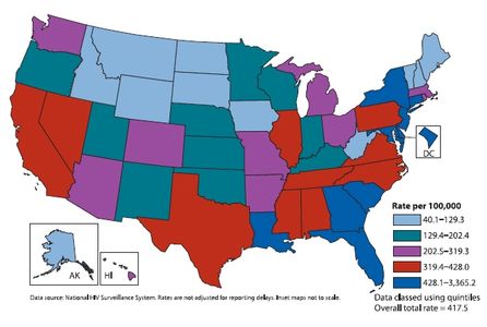 The following map shows the ranges of rates of persons living with a diagnosis of HIV infection at the end of 2011, by state; predominantly, states in the South and the Northeast report the highest rates. In 2011, the overall total rate for persons living with a diagnosis of HIV infection in the United States was 417.5/100,000 population.